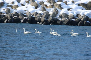 港周辺にはオオハクチョウが優雅に列をなして泳いでいました。
