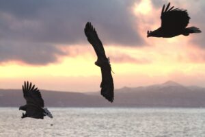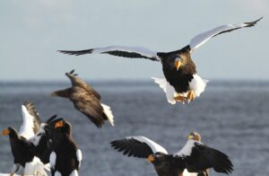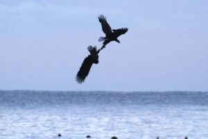 空中で足を絡め魚を奪い合うワシ達の爪の力は物凄く