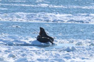 流氷が来る前の時期に観察出来ることが多いですが、去年は珍しく流氷の上で休んでいるトドの姿も見られました。