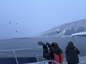 すぐにワシたちが集まって、あっという間に30羽近いワシたちが船の周りを飛んでいました。