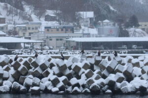 港のテトラポッドにはワシたちがずらり。留まっていると置物のようにも見えます。