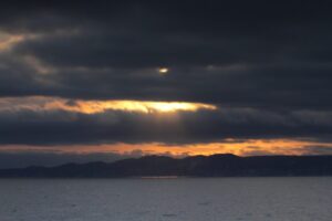 太陽が昇り、海面は黄金色の筋が伸び輝いておりました。