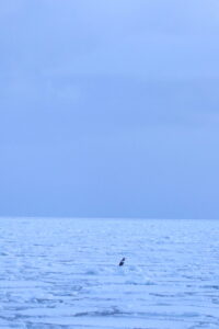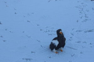 流氷の上にはうっすら雪も積もっており、雪の上にはワシ達の足跡がありました。