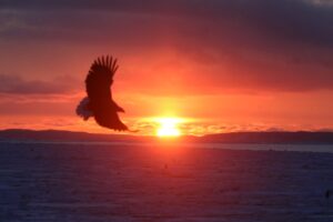 朝日に照らされながら大きな翼を羽ばたかせていました。