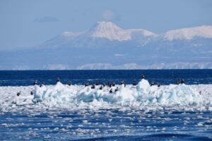 かなり沖合遠くに流されてしまった流氷ですが、20分ほど沖合へ走ると到達することができました。