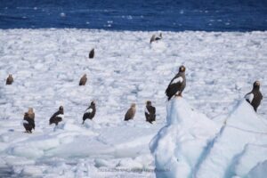 船よりも大きい流氷の塊にはたくさんのワシたちがとまっていました。