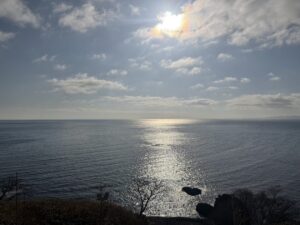 朝6時頃、丘から沖を見てみると白波の中に複数の潮吹きが見えました。