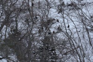 8:30便が出港し、山の木々を見てみると多くのワシ達が木の上で休んでいました。