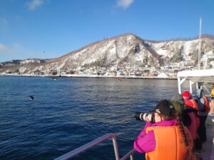 オオワシやオジロワシは多い時で防波堤に120羽ほど確認。