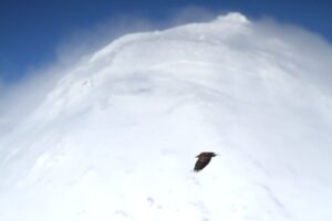 羅臼岳の手前を飛んでいるのはオジロワシです。