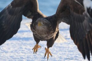 キリっと睨みをきかせオオワシが降り立つ姿、圧倒されますね。