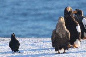 カラスはワシを怖がる様子はなく、たまにワシの羽を引っ張ったりとちょっかいを出すこともあります。