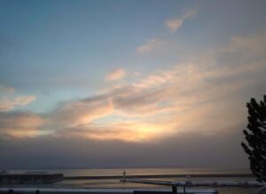 朝早い時間は、沖は雲が厚いものの青空も見え