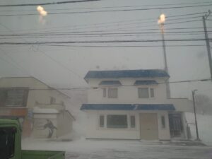 知床ネイチャークルーズの事務所、羅臼町本町はずっと暴風雪。