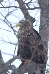 わりと低い木々にもワシ達の姿が見え、木に佇むオジロワシが近くで観察出来ました。