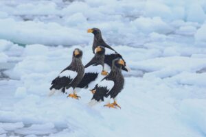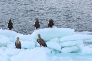 重なった氷の上は見晴らしが良いのかワシ達に人気でした。