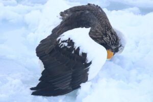こちらは他のワシに餌を横取りされないように背中を丸めながら餌を食べているオオワシ。