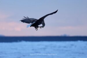 朝一番でお腹が減っているのか器用に空中で魚を食べるオジロワシの姿も。