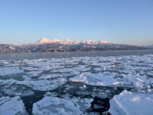 流氷と流氷の間の海面が早朝便では凍っていることが多く、すが氷とも呼ばれます。