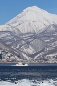 羅臼岳と漁船と流氷とワシ。羅臼ならではの光景です^^