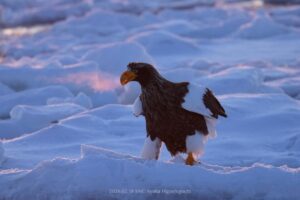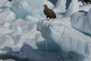 折り重なった巨大な流氷の上には沢山のオオワシ、オジロワシの姿がありました。