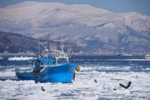 遠くで操業していた漁船が流氷の隙間を縫って近づいてきました。