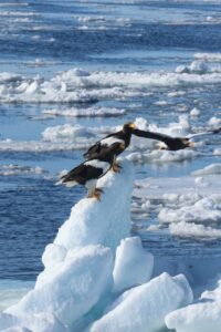 近くの小さな流れ氷には複数のワシが留まっていました。