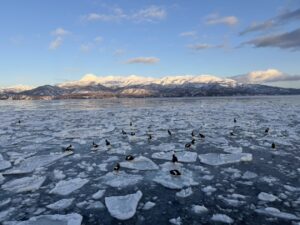 オオワシたちの奥には漁船が操業している明かりが見えます。