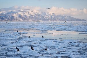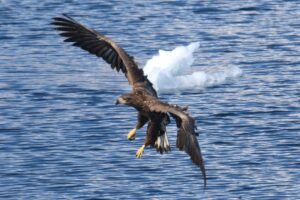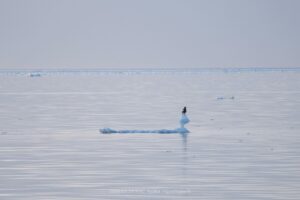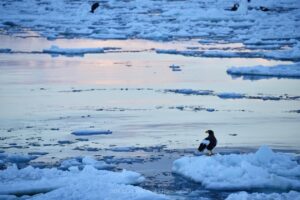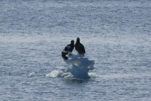 近くの小さな流れ氷には複数のワシが留まっていました。