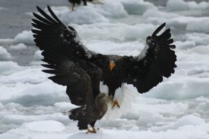 オジロワシが餌を食べているとオオワシが横取りしに向かってきました。