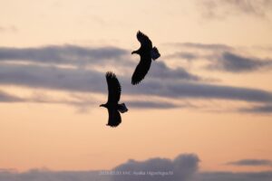 オジロワシが餌を食べているとオオワシが横取りしに向かってきました。