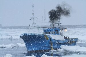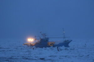 流氷の中をずんずんと進んで行く姿はとても迫力があります。羅臼では流氷が来る時期でも漁が行われています。