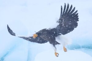 こちらはさまざまな形の小さな流氷が重なり合いそこにできたステージにオオワシが佇みます。