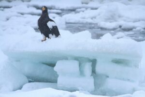大きく高い流氷の上にちょこんと乗ったオオワシ。