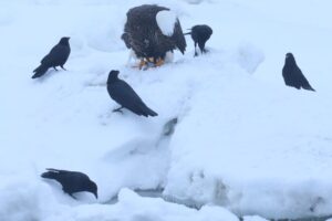 カラスたちはオオワシの餌を狙っているようでずっと周りをウロウロ。
