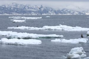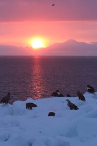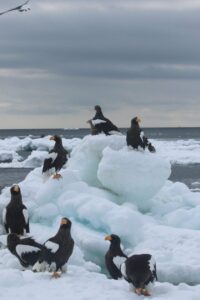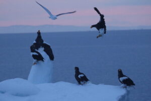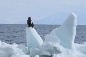 こちらの流氷は大きな塊がいくつも重なっており、その周りにはワシが集まっていました。
