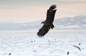 赤く染まる景色とオオワシやオジロワシの飛翔姿もかっこよく