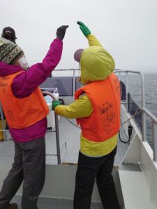 ポイントへ到着する前に、鯨類の発見ポイントをお客様にレクチャー。
